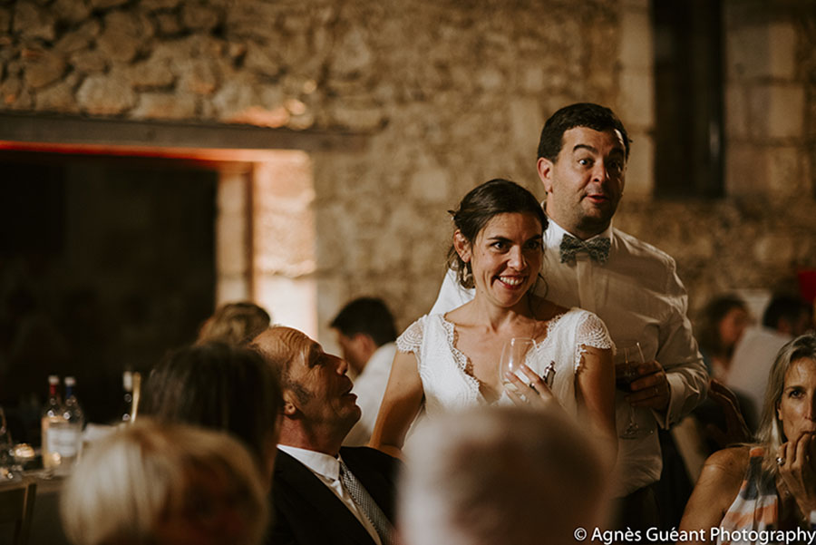 Contraints de se marier civilement le vendredi à Bègles, Lauren et Quentin avaient envie d’une célébration officielle le jour J sans pour autant se rendre à l’église. Ayant déjà assisté à deux cérémonies laïques, ce choix fut pour eux une évidence. Mais si Carole a pour habitude d’officier, le couple a préféré faire endosser ce rôle à deux proches. Ces derniers ont bénéficié d’un accompagnement sur-mesure tout au long des mois de préparation : les futurs mariés ont été guidés dans leur choix de rituels et de textes et les maîtres de cérémonie n’ont eu qu’à se laisser porter, la wedding planner ayant tout calibré à la minute près : « que ce soit trop long pour les invités était peut-être la seule inquiétude que nous avions », remarque Lauren. Au final, tout le monde a trouvé ce moment « très beau ».
